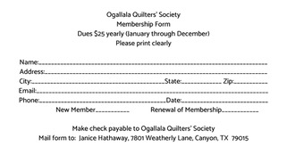 Membership in Ogallala Quilter's Society runs from January to December each year. Your membership allows free admission to our quilt festival, one free quilt entry, and newsletters keeping you up to date with Ogallala Happenings. Thank you for your continued support of Ogallala Quilter's Society.